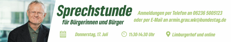 Die nächste Sprechstunde findet am Donnerstag, dem 17.07.2025, von 11.30 bis 14.30 Uhr am Burgunderplatz 7a in Limburgerhof statt. Auf Wunsch sind auch Telefon- und Zoom-Gespräche möglich. Um vorherige Anmeldung über das Wahlkreisbüro wird gebeten.
