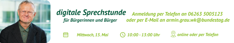 Die nächste Sprechstunde findet am Donnerstag, dem 12.05.2026, von 10.00 bis 13.00 Uhr digital oder telefonisch statt. Um vorherige Anmeldung über das Wahlkreisbüro wird gebeten.